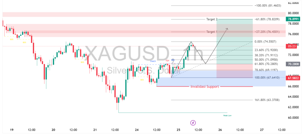Pergerakan XAGUSD pada timeframe 1 jam menunjukkan momentum bullish mulai terbentuk setelah harga berhasil menembus area resistance minor dan membentuk struktur higher high. Kenaikan tajam terbaru diikuti dengan potensi koreksi sehat menuju area Fibonacci 50% = 61,8% di sekitar 71.0 – 70.2 sebagai zona demand kuat. Selama harga mampu bertahan di atas area ini, peluang kelanjutan tren naik tetap terbuka dengan target terdekat di kisaran 76.4 hingga 78.8.