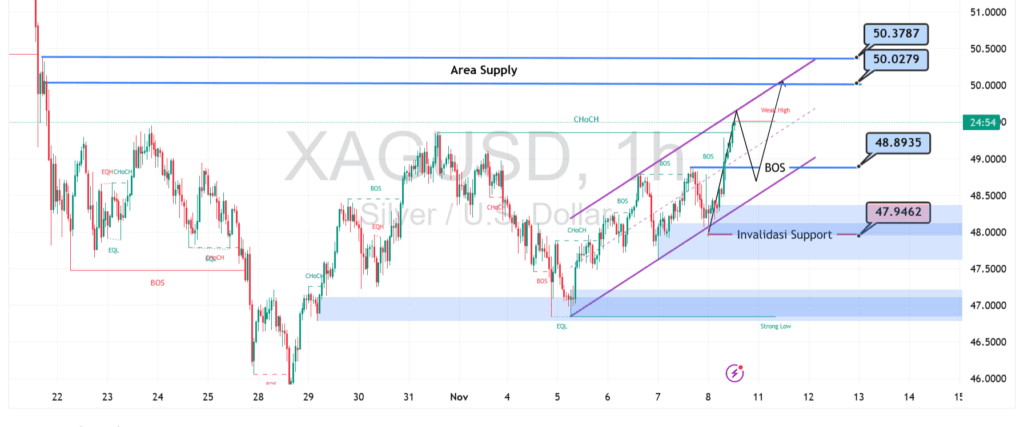 Pergerakan XAGUSD mendekati area supply $50,02–$50,37, yang bisa menjadi titik balik sebelum melanjutkan kenaikan. Setelah reli kuat beberapa hari terakhir, pasar mulai menunjukkan tanda potensi koreksi jangka pendek.
