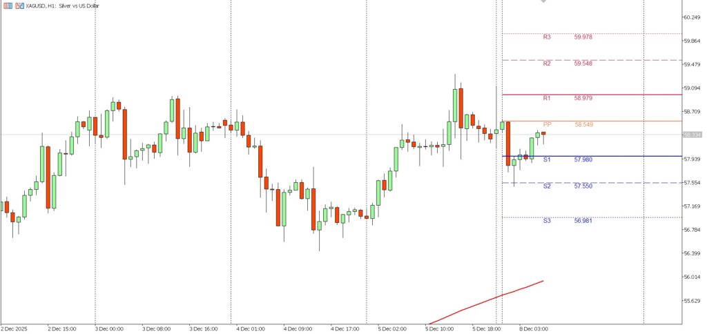 Silver bergerak dalam bias bullish moderat setelah bertahan di atas S1 di 57.98 dan mulai mencoba kembali ke area pivot 58.54. Jika harga mampu menembus R1 di 58.97, peluang menuju R2 di 59.54 hingga R3 di 59.97 semakin terbuka.