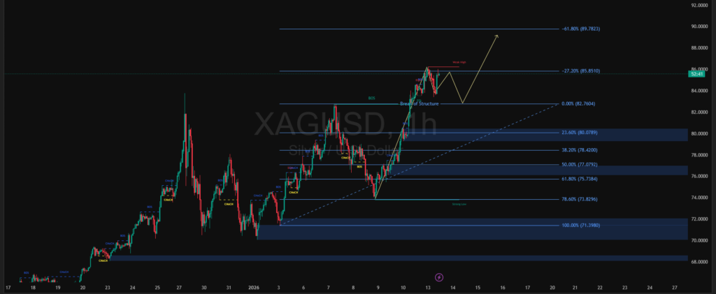 Pergerakan XAGUSD pada timeframe satu jam menunjukkan struktur tren naik yang masih terjaga. Harga berhasil mencetak break of structure dan bertahan di atas area support dinamis garis tren, menandakan dominasi buyer belum sepenuhnya hilang. Selama perak mampu menjaga area demand di sekitar zona Fibonacci menengah, tekanan koreksi dipandang sebagai peluang pullback sehat dalam fase bullish, bukan sinyal pembalikan arah.