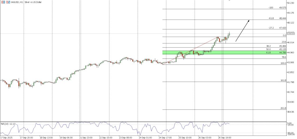 Dari sisi teknikal, target kenaikan berikutnya mengarah ke level Fibonacci ekstensi di $47,4 hingga $48,4 per troy ounce. Selama harga tetap di atas zona hijau support, peluang kelanjutan tren naik lebih besar dibanding potensi koreksi dalam jangka pendek.