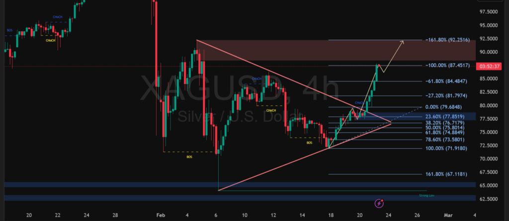Harga perak pada grafik XAGUSD 4 jam menunjukkan tren naik setelah menembus pola segitiga, menandakan tekanan beli semakin dominan. Kenaikan ini diperkuat oleh posisi harga yang sudah melewati level Fibonacci penting dan bergerak mendekati area resistance sekitar 87, sehingga peluang lanjutan tren bullish masih terbuka.