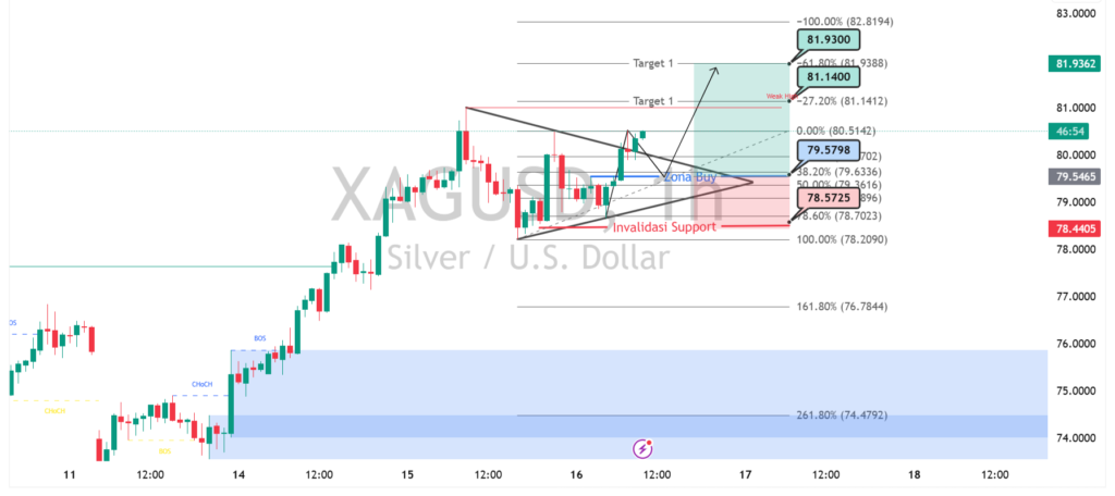 Pergerakan XAGUSD menunjukkan tren bullish yang masih terjaga setelah harga berhasil menembus area konsolidasi dan membentuk pola segitiga simetris. Breakout ke atas mengindikasikan dorongan beli yang kuat, dengan harga kini bergerak di atas zona kunci sekitar 79.50 sebagai area konfirmasi. Selama harga mampu bertahan di atas level tersebut, potensi kenaikan lanjutan tetap terbuka dengan target terdekat di kisaran 81.10 hingga 81.90.