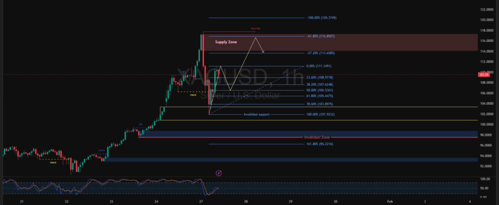 Di sisi atas, area supply zone menjadi fokus utama sebagai target kenaikan berikutnya. Selama harga mampu bergerak stabil dan melakukan pullback sehat, peluang rebound menuju resistance terdekat tetap terbuka. Namun, apabila harga turun menembus level invalidasi support, skenario koreksi lebih dalam perlu diwaspadai. Secara keseluruhan, bias teknikal perak masih cenderung positif dengan pendekatan buy on pullback selama struktur tren tetap terjaga.