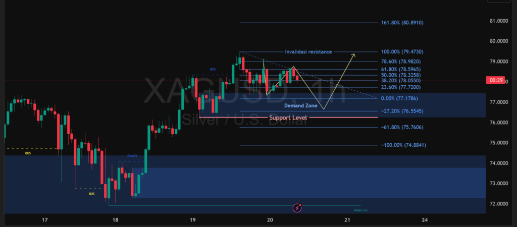 XAGUSD timeframe satu jam masih bergerak dalam konsolidasi dengan bias naik selama harga bertahan di atas demand zone 77.17 – 77.72. Area ini menjadi kunci karena berdekatan dengan support teknikal dan retracement Fibonacci. Jika terjadi pantulan, peluang kenaikan menuju 78.98 hingga 79.47 tetap terbuka, apalagi bila resistance trendline berhasil ditembus.