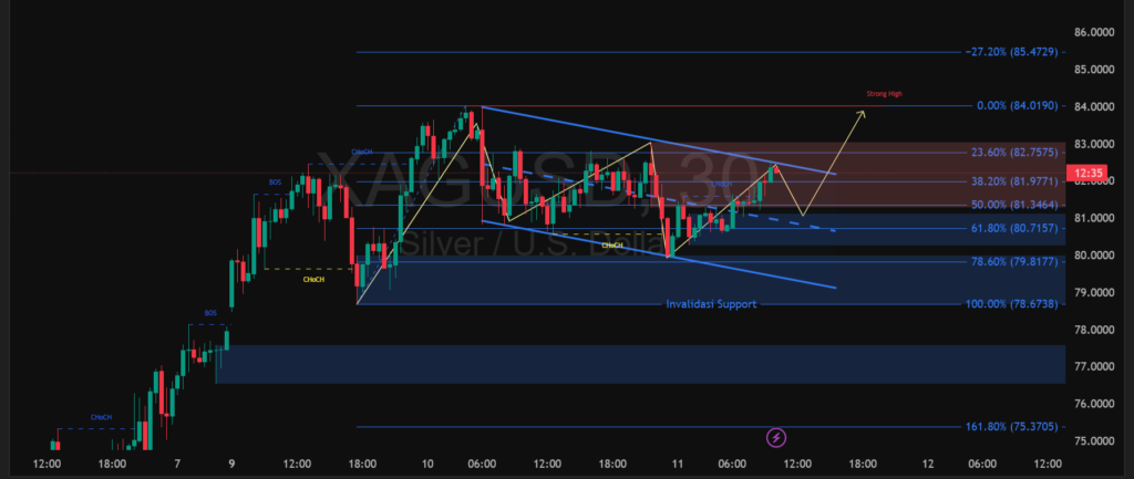 Pergerakan XAGUSD pada timeframe satu jam menunjukkan fase konsolidasi setelah reli kuat sebelumnya. Harga kini bergerak di dalam pola penyempitan dengan batas atas berada di area supply dan sisi bawah ditopang zona demand yang cukup solid. Reaksi berulang di level Fibonacci 38,2% hingga 61,8% menandakan area tersebut menjadi titik krusial yang sering memicu pantulan maupun tekanan jual. Struktur ini mencerminkan pasar sedang menunggu katalis sebelum menentukan arah lanjutan.