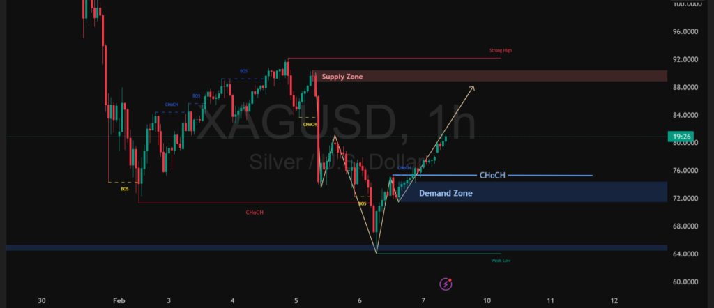 XAGUSD timeframe satu jam menunjukkan pemulihan kuat setelah mematahkan tren turun dan membentuk higher low. Harga kini bergerak naik mendekati zona supply, sementara area demand di bawah menjadi penopang jika terjadi koreksi.