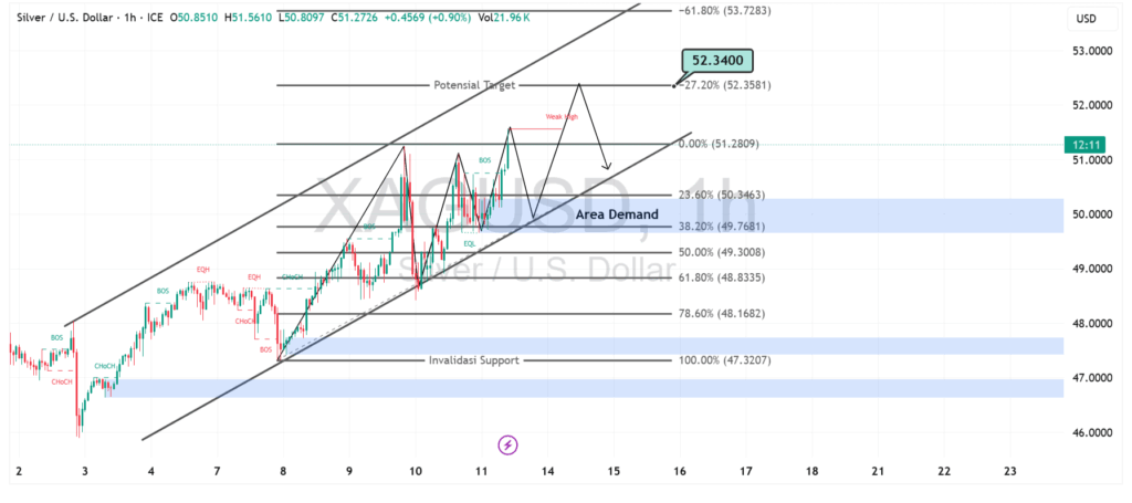 Harga perak (XAG/USD) terus bergerak dalam tren naik kuat, bertahan di sekitar $51,27 per ons dengan potensi menuju $52,34 jika tekanan beli berlanjut. Struktur pasar menunjukkan momentum bullish solid selama area demand di $49,76–$50,34 mampu menahan koreksi.