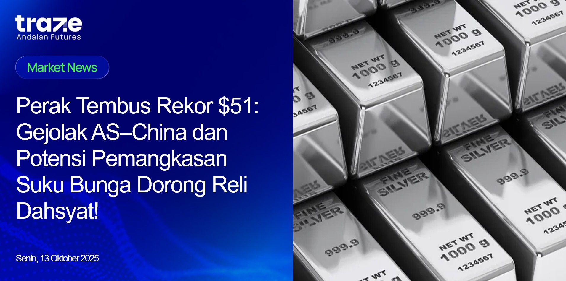 Harga perak melonjak lebih dari 2% ke atas level $51 per ons pada Senin (13/10), menandai rekor tertinggi baru sepanjang masa. Lonjakan ini dipicu oleh meningkatnya kekhawatiran terkait hubungan dagang AS–China, ketidakstabilan politik global, serta ekspektasi pemangkasan suku bunga lanjutan oleh The Fed yang mendorong minat terhadap aset aman.