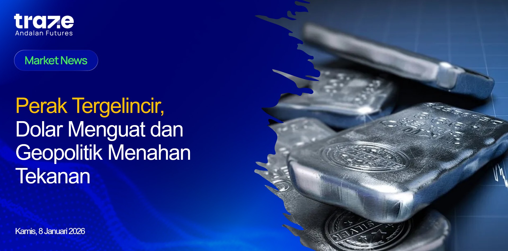 Meski terkoreksi, prospek perak tetap mendapat dukungan dari faktor geopolitik dan fundamental jangka menengah. Ketegangan terkait intervensi AS di Venezuela serta hubungan China – Jepang menjaga minat terhadap aset lindung nilai. Di sisi lain, keterbatasan pasokan dan permintaan kuat dari sektor industri serta investasi membuat harga silver masih bertahan dekat level tertinggi sepanjang masa.