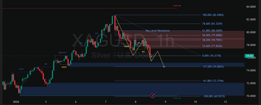 Pergerakan harga perak (XAGUSD) menunjukkan tekanan teknikal setelah gagal bertahan di area resistance kunci. Struktur harga membentuk rangkaian penurunan dengan sinyal perubahan karakter pasar, ditandai oleh pelemahan momentum beli dan respons kuat dari zona penawaran. Selama harga masih tertahan di bawah area resistensi tersebut, potensi koreksi lanjutan tetap terbuka, mencerminkan dominasi seller dalam jangka pendek.