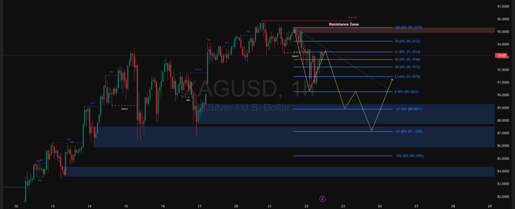 Pergerakan XAGUSD pada timeframe H1 menunjukkan tekanan jual masih membayangi setelah harga gagal bertahan di area resistance kuat dekat puncak sebelumnya. Struktur pasar mengindikasikan perubahan karakter (CHoCH) dari bullish ke korektif, ditandai penurunan tajam dari zona atas dan reaksi harga yang tertahan di sekitar area Fibonacci 50% – 61,8%. Selama harga belum mampu kembali menembus area tersebut, potensi rebound cenderung bersifat terbatas.