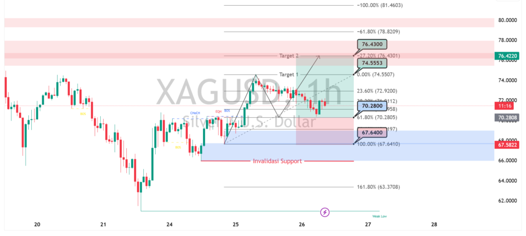 Pergerakan XAGUSD pada timeframe 1 jam terlihat masih bergerak dalam fase konsolidasi setelah gagal mempertahankan momentum kenaikan sebelumnya. Struktur harga menunjukkan pola koreksi dengan area support kuat di sekitar 70.28 yang bertepatan dengan level Fibonacci 61.8%. Selama area ini mampu bertahan, potensi rebound tetap terbuka, meskipun tekanan jual masih terlihat dari lower high yang terbentuk dalam pergerakan terbaru.