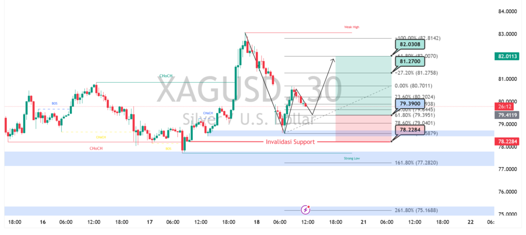 Pergerakan XAGUSD pada timeframe 30 menit menunjukkan tekanan jual masih mendominasi setelah harga gagal mempertahankan area atas di sekitar 82.00. Struktur pasar mulai berubah dari bullish ke netral cenderung bearish, terlihat dari penolakan di zona “weak high” serta terbentuknya lower high. Saat ini harga bergerak di dekat area kunci 79.30 yang menjadi pivot penting. Jika level ini ditembus secara konsisten, potensi pelemahan lanjutan semakin terbuka dengan target menuju area support berikutnya.