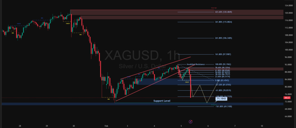 Selama harga tertahan di bawah area invalidasi tersebut, peluang koreksi lanjutan masih terbuka menuju zona support utama di bawah. Proyeksi Fibonacci extension menunjukkan target penurunan bertahap ke level 0% hingga -61,8% yang berdekatan dengan area demand. Skenario bearish ini tetap dominan selama tidak ada penutupan harga yang mampu kembali menembus resistance, sehingga bias teknikal perak cenderung melemah dalam waktu dekat.