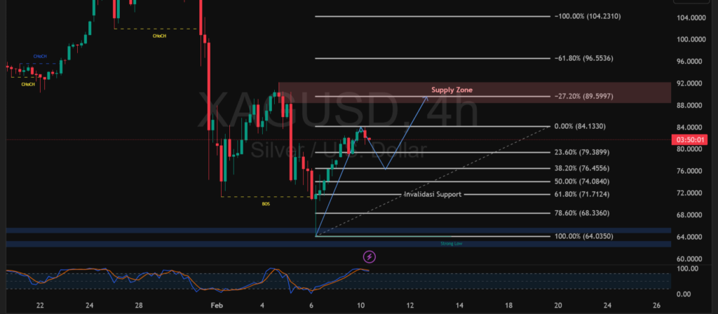 Pergerakan XAGUSD timeframe empat jam menunjukkan fase pemulihan setelah tekanan jual ekstrem yang membentuk strong low di area 64. Harga kini bergerak naik dan mendekati resistance 84 yang bertepatan dengan level Fibonacci 0%. Struktur kenaikan membentuk higher low bertahap, menandakan minat beli mulai kembali menguasai pasar meski laju tertahan menjelang zona suplai.