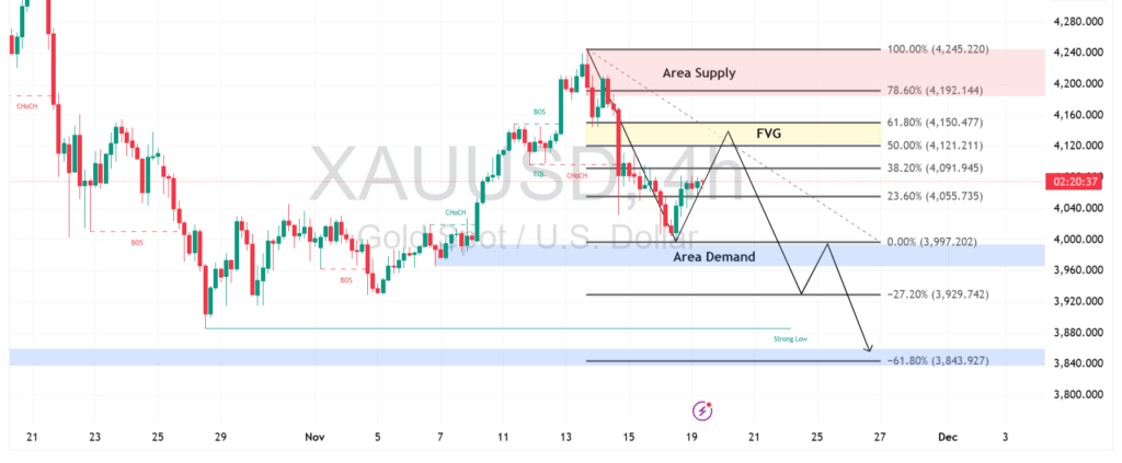 Jika penurunan berlanjut, emas berpotensi bergerak menuju Area Demand sekitar $3.997. Respons di wilayah ini akan menentukan apakah harga dapat bertahan atau justru melanjutkan pelemahan yang lebih dalam hingga $3.929.