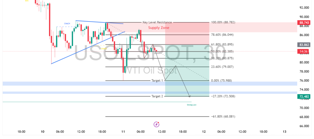 Analisis teknikal pada USOIL timeframe 30 menit menunjukkan harga minyak mulai kehilangan momentum kenaikan setelah memasuki area supply kuat di sekitar 86 – 88. Penolakan dari zona resistance tersebut memicu tekanan jual yang mendorong harga kembali bergerak turun ke area Fibonacci 50% di kisaran 82. Level ini menjadi titik krusial karena sebelumnya berfungsi sebagai area keseimbangan antara pembeli dan penjual.