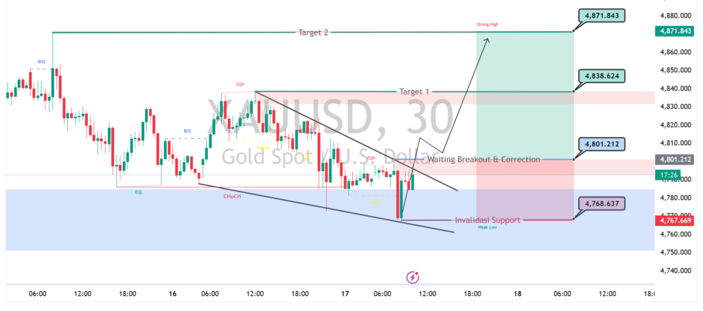 Selama harga mampu bertahan di atas area 4.768, peluang kenaikan menuju resistance 4.801 hingga 4.838 tetap terbuka. Breakout valid di atas zona tersebut dapat mendorong penguatan lanjutan ke area 4.871 sebagai target berikutnya. Namun, jika kembali turun dan menembus support kunci, tekanan jual berpotensi berlanjut dan membatalkan skenario bullish yang sedang terbentuk.