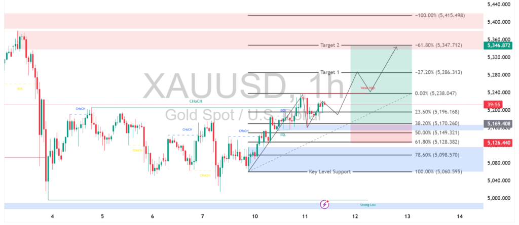 Selama harga mampu bertahan di atas area support Fibonacci sekitar 5.170, peluang kenaikan masih terbuka dengan target pertama di kisaran 5.286 dan target lanjutan mendekati 5.347. Namun jika tekanan jual meningkat dan harga turun di bawah area support tersebut, emas berpotensi melakukan koreksi lebih dalam menuju zona 5.128 hingga 5.098 sebagai area pertahanan berikutnya. Oleh karena itu, pelaku pasar perlu memperhatikan reaksi harga di area support untuk mengonfirmasi arah pergerakan selanjutnya.