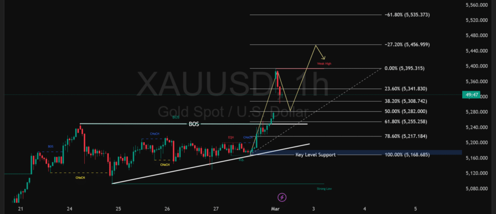 Emas (XAUUSD) pada timeframe 1 jam menunjukkan tren naik kuat setelah berhasil menembus area struktur penting (break of structure) di sekitar 5.255 – 5.280. Pergerakan impulsif membawa harga mencapai puncak baru di kisaran 5.390 sebelum mengalami koreksi sehat. Area Fibonacci 38,2% – 50% di sekitar 5.280 – 5.310 kini menjadi zona reaksi krusial yang berpotensi menjadi titik pantul. Selama harga bertahan di atas garis tren naik dan support dinamis tersebut, peluang melanjutkan kenaikan menuju resistance 5.450 hingga 5.530 tetap terbuka.