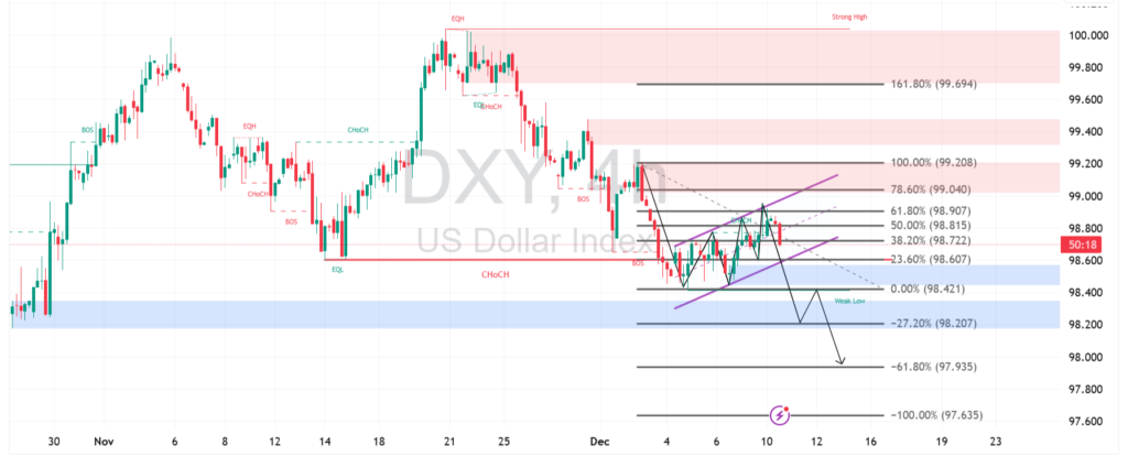 Selama harga bertahan di bawah kanal naik ungu, peluang penurunan menuju area demand 98.42 hingga 98.20 semakin besar, bahkan berpotensi memperpanjang pelemahan menuju 97.90 apabila tekanan seller tidak mereda.