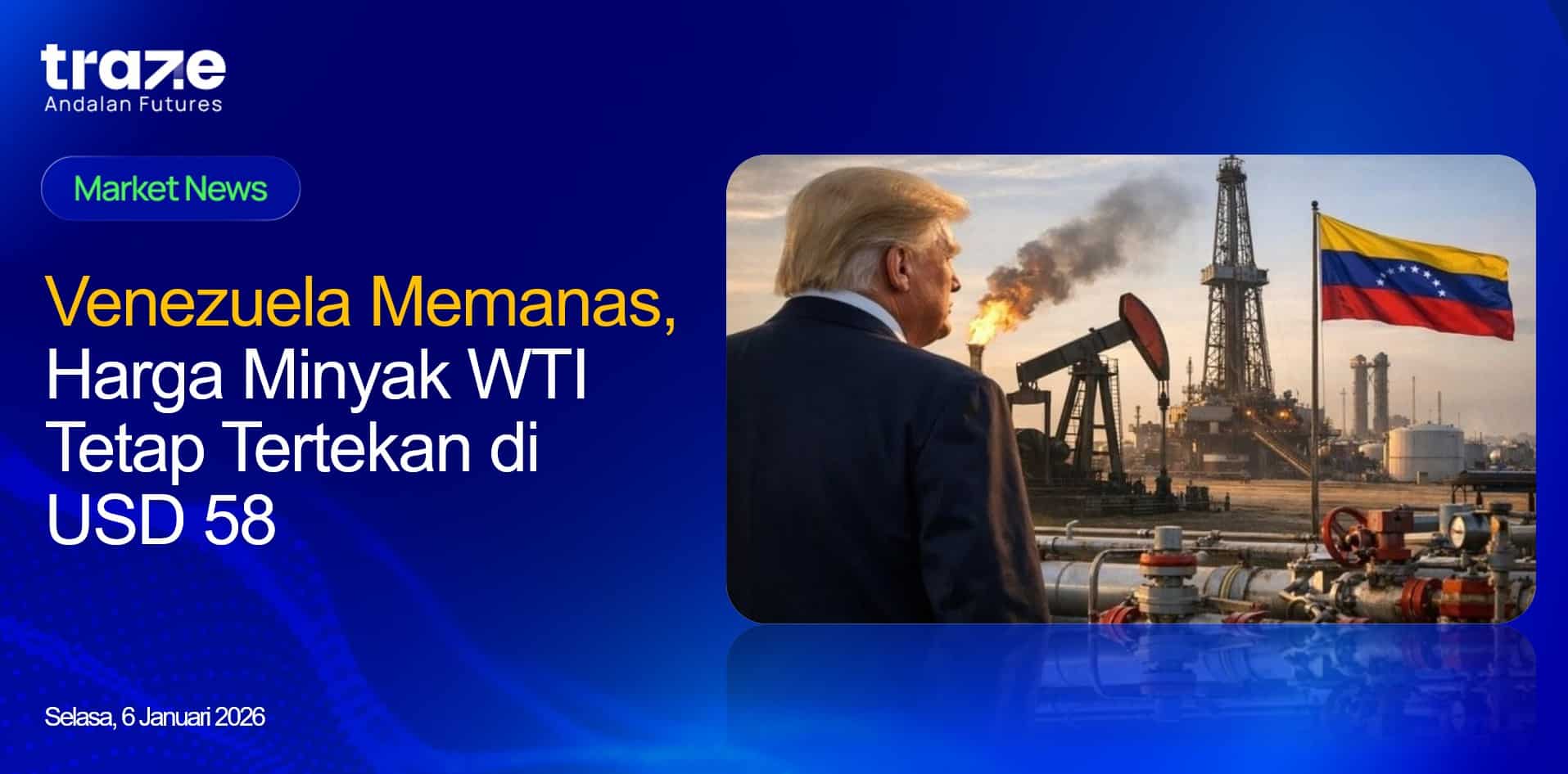 Harga minyak mentah WTI bergerak stabil di kisaran USD 58,2 per barel pada Selasa (06/01), usai sesi perdagangan yang bergejolak sehari sebelumnya dan ditutup menguat 1,7%. Sentimen pasar masih dipengaruhi meningkatnya ketegangan geopolitik yang melibatkan Venezuela, sehingga pelaku pasar mencermati potensi dampaknya terhadap keseimbangan energi global.