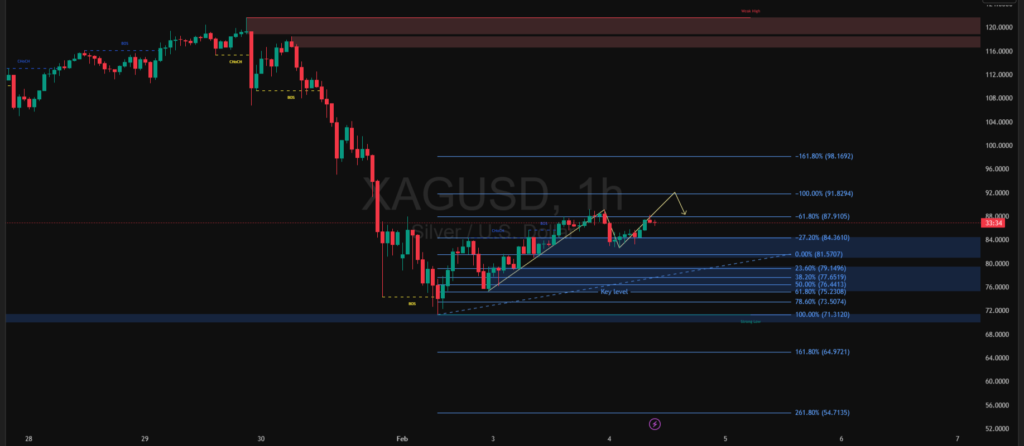Pergerakan XAGUSD pada timeframe satu jam menunjukkan fase pemulihan setelah tekanan jual tajam sebelumnya. Harga membentuk struktur kenaikan bertahap yang ditandai perubahan karakter tren dan penembusan minor resistance, mengindikasikan momentum beli mulai mendominasi. Selama harga bertahan di atas area support utama, peluang lanjutan penguatan masih terbuka.