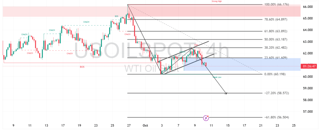 Selama harga berada di bawah area $66,00, sentimen tetap negatif. Sinyal pembalikan baru akan terlihat jika WTI mampu menembus kembali di atas $63,00 dengan dorongan volume kuat.