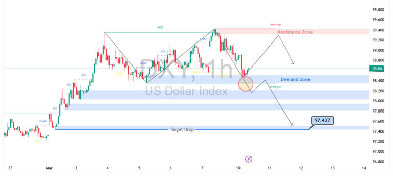 Analisis teknikal US Dollar Index (DXY) timeframe 1 jam menunjukkan pergerakan harga sedang menguji area demand penting setelah mengalami tekanan dari zona