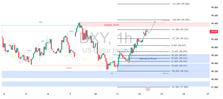 Indeks Dolar AS (DXY) pada timeframe H1 menunjukkan pemulihan kuat setelah memantul dari area demand 98.20 – 98.40. Reaksi beli di zona