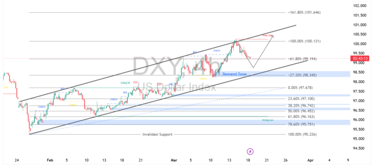 Indeks Dolar AS (DXY) pada timeframe 1 jam masih bergerak dalam tren naik yang terlihat dari pola channel ascending. Namun, harga mulai