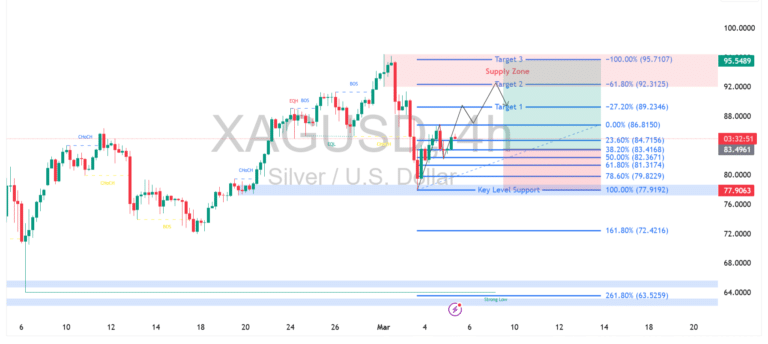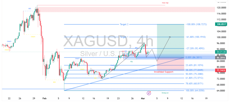 Pergerakan XAGUSD pada timeframe empat jam menunjukkan tren naik yang solid setelah harga membentuk struktur higher low sejak pertengahan Februari. Kenaikan ini