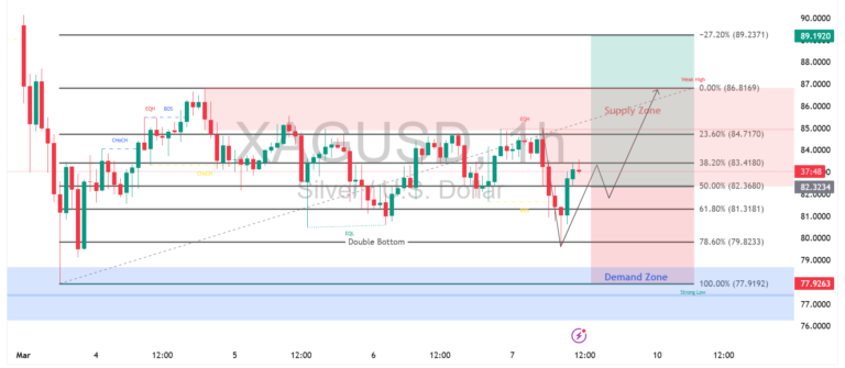 Pergerakan perak (XAGUSD) pada timeframe satu jam menunjukkan tanda pemulihan setelah harga memantul dari area kuat di sekitar 80 yang membentuk pola