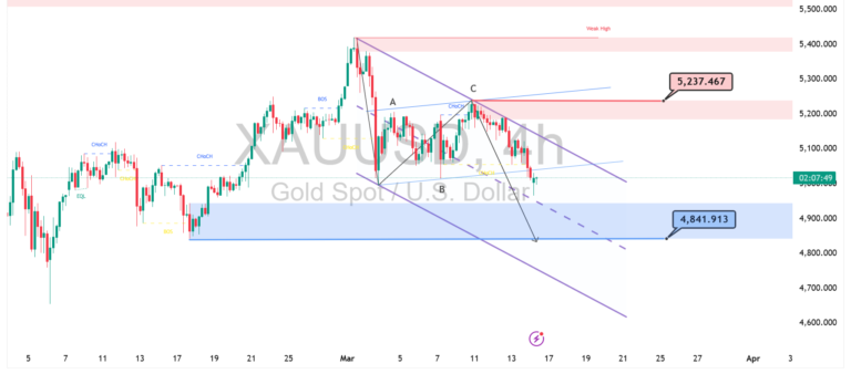 Harga emas (XAU/USD) masih bergerak dalam tekanan setelah gagal mempertahankan kenaikan di area puncak sebelumnya. Pada grafik terlihat terbentuk pola koreksi dengan