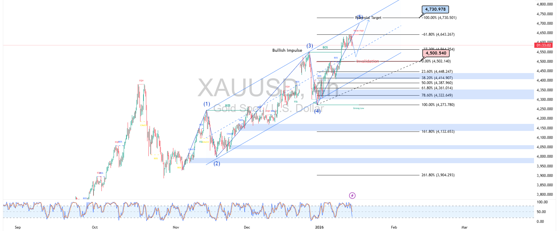 Dari sisi Fibonacci retracement, area koreksi ideal berada di zona 38,2% hingga 61,8%, yang berpotensi menjadi support kuat untuk kelanjutan kenaikan. Selama harga mampu bertahan di atas area invalidation sekitar 4.502, peluang rebound tetap terbuka. Penurunan menuju demand zone justru bisa dimanfaatkan sebagai area akumulasi dengan risiko terukur.