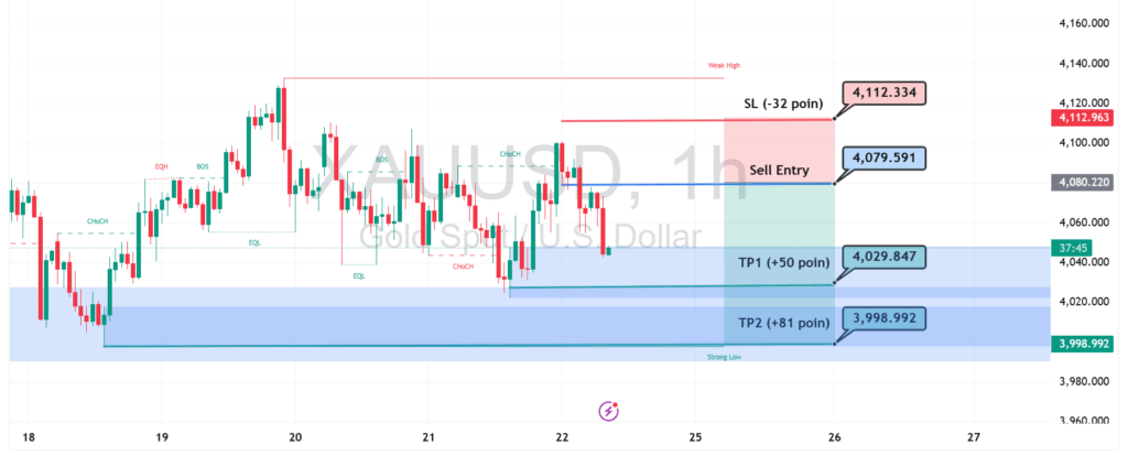 Harga emas kembali melemah setelah penolakan kuat di area 4.080, menandakan seller masih dominan pada timeframe 1 jam. Struktur yang berubah bearish membuka peluang pergerakan turun lebih dalam.