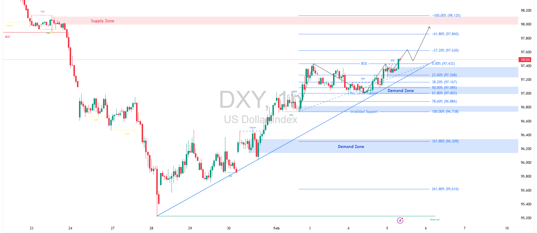 DXY (Index Dolar) pada timeframe satu jam menunjukkan tren naik yang terjaga setelah harga konsisten membentuk higher low di atas garis tren. Pergerakan menguat dari zona demand bawah dan berhasil mencetak break of structure, menandakan dominasi pembeli masih solid. Area 23,6% hingga 38,2% Fibonacci kini berperan sebagai penopang terdekat yang menjaga ritme kenaikan tetap stabil.