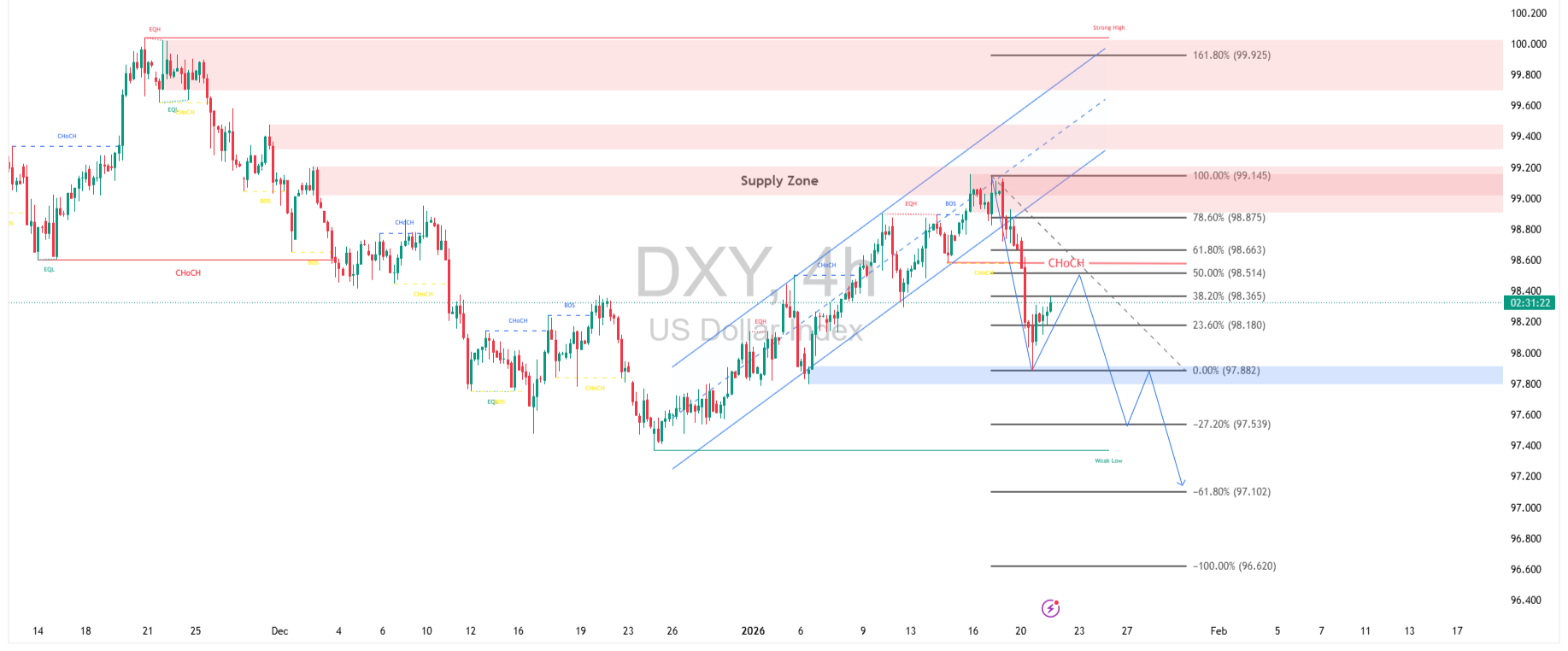 Dari sudut pandang teknikal, penurunan DXY membawa harga kembali ke area retracement penting yang kini berperan sebagai penentu arah selanjutnya. Selama indeks berada di bawah resistance terdekat, peluang koreksi lanjutan masih terbuka dengan target pengujian zona demand yang lebih rendah. Reaksi harga di area ini akan menjadi kunci untuk mengukur kekuatan pasar.