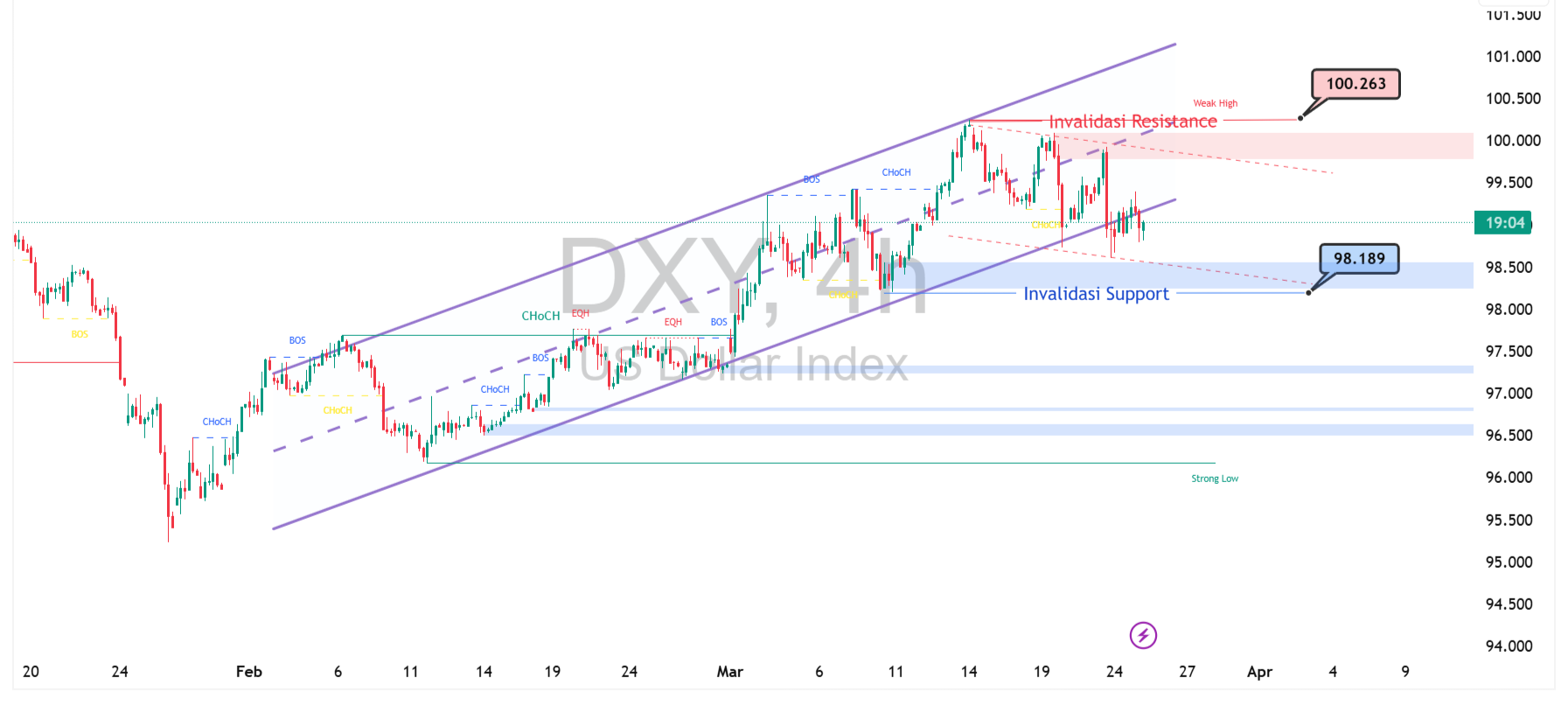 Pergerakan indeks dolar AS (DXY) pada timeframe 4 jam menunjukkan tren naik yang masih terjaga dalam pola channel ascending. Harga bergerak konsisten membentuk higher high dan higher low, menandakan dominasi buyer tetap kuat. Namun, saat ini terlihat adanya penolakan di area resistance sekitar 100.000–100.263 yang menjadi zona krusial. Selama belum ada penembusan valid di atas area ini, potensi koreksi jangka pendek masih terbuka.