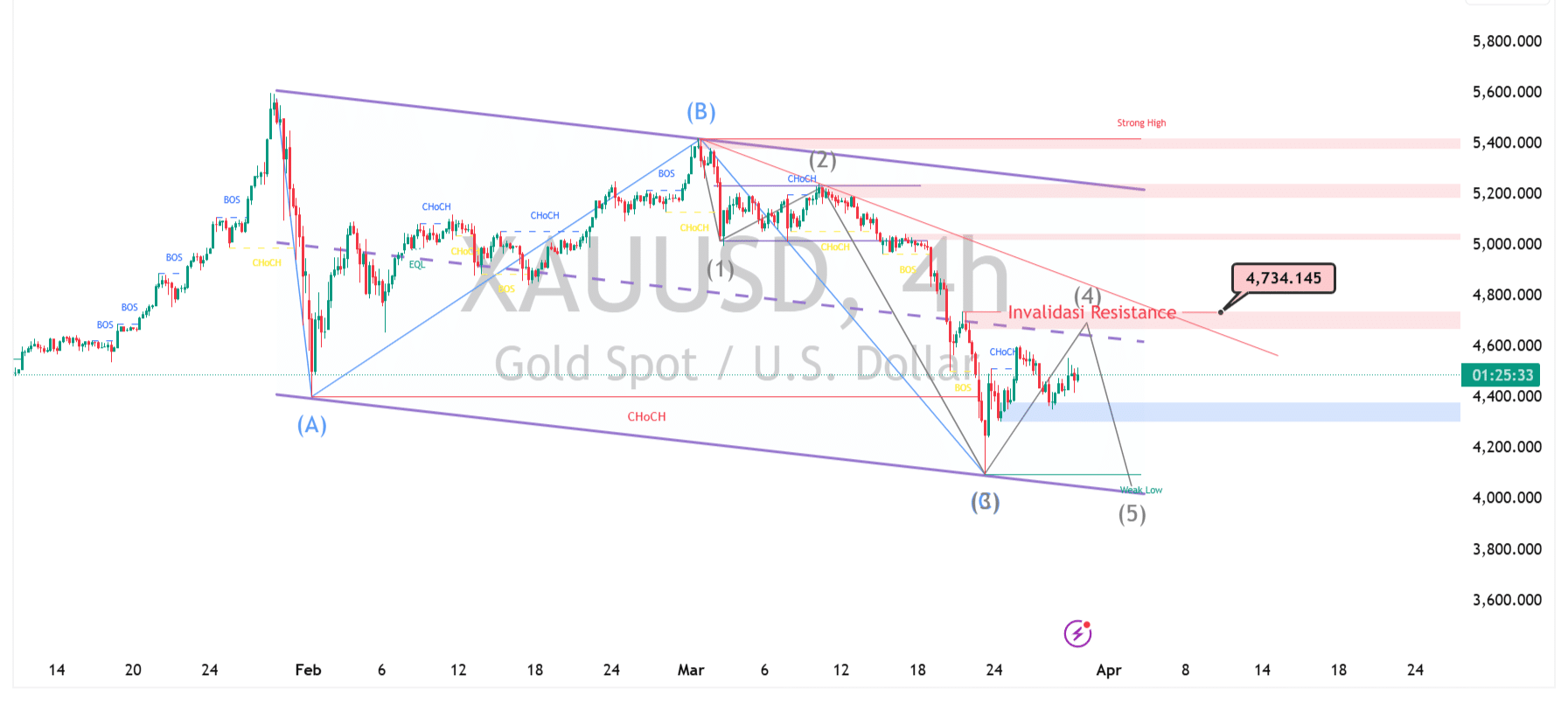 Saat ini harga berpotensi berada di fase gelombang (4), yaitu koreksi naik sementara. Area resistance sekitar 4.700 – 4.800 menjadi zona krusial untuk validasi, di mana gelombang ini biasanya bersifat terbatas dan tidak melewati puncak gelombang (2). Selama harga tertahan di bawah area tersebut, struktur wave tetap valid dalam skenario bearish.
