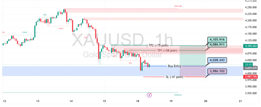 Apabila dorongan naik berlanjut, target terdekat berada di 4,086.911 sebagai TP1. Kenaikan yang mampu menembus area tersebut membuka peluang menuju TP2 di 4,105.916, yang juga berdekatan dengan zona penawaran sebelumnya.