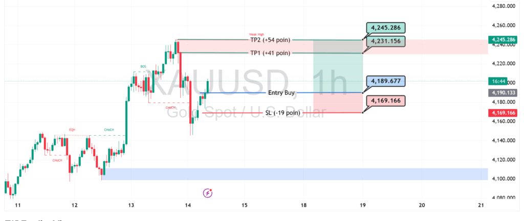 Area Entry Buy berada di sekitar 4.189, sementara Stop Loss diletakkan di 4.169 untuk menjaga risiko. Selama harga tidak turun melewati area tersebut, peluang kenaikan masih terbuka.