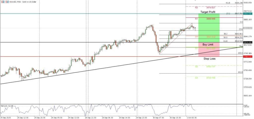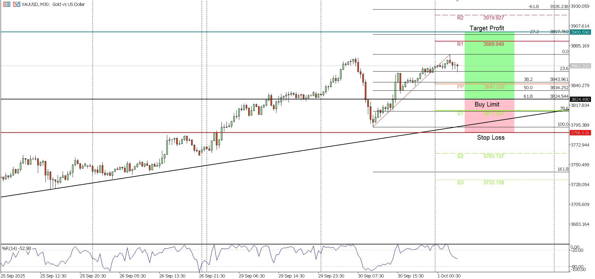 Strategi yang banyak diperhatikan trader adalah skenario buy limit di kisaran $3,824 dengan potensi stop loss di bawah $3,786 untuk meminimalisir risiko. Sementara itu, level resistance terdekat berada di $3,889 dan menjadi pintu utama menuju target profit di sekitar $3,900. Jika area ini berhasil ditembus, prospek kenaikan dapat berlanjut ke resistance lanjutan di $3,919.