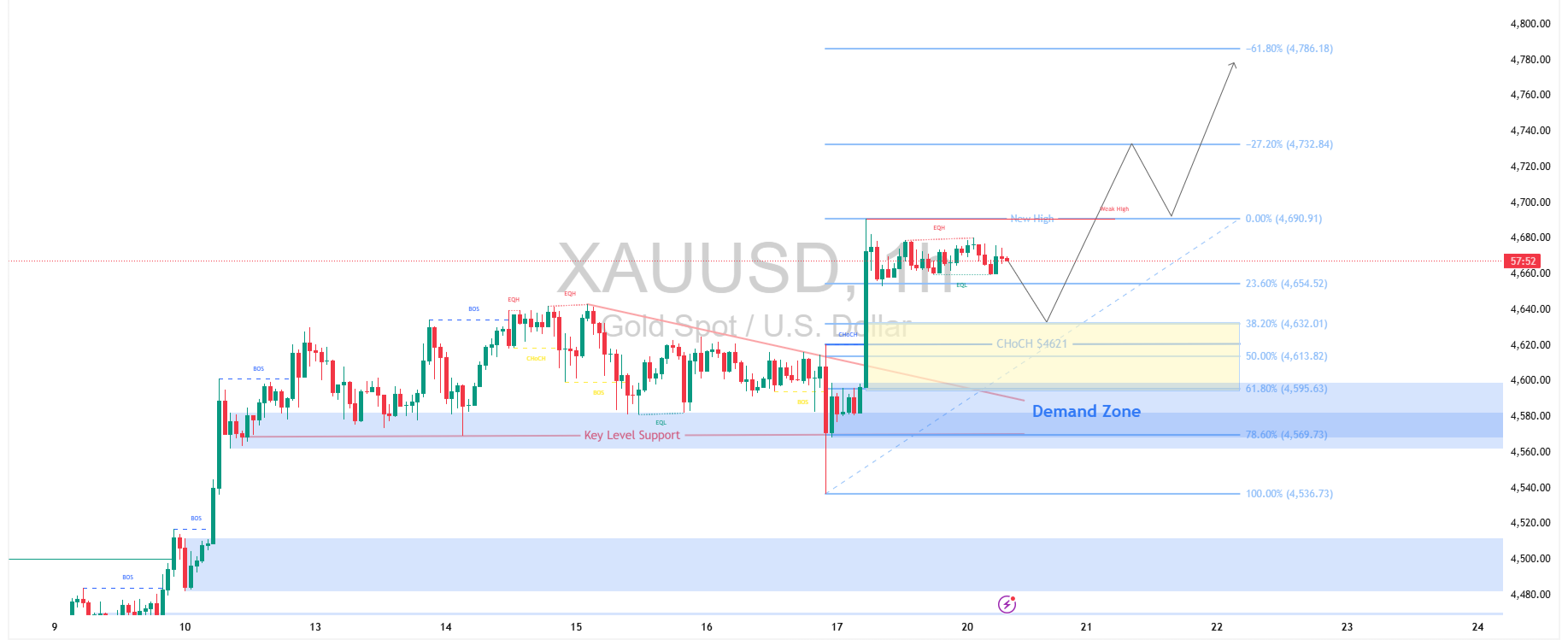 Dari sisi teknikal, zona demand di kisaran 4.560–4.595 menjadi area penting yang sebelumnya memicu dorongan naik signifikan. Reaksi beli kuat dari zona tersebut mengonfirmasi minat pasar yang masih solid, sekaligus memperkuat struktur tren naik jangka pendek. Area ini berfungsi sebagai fondasi utama apabila terjadi koreksi sehat sebelum kelanjutan reli.
