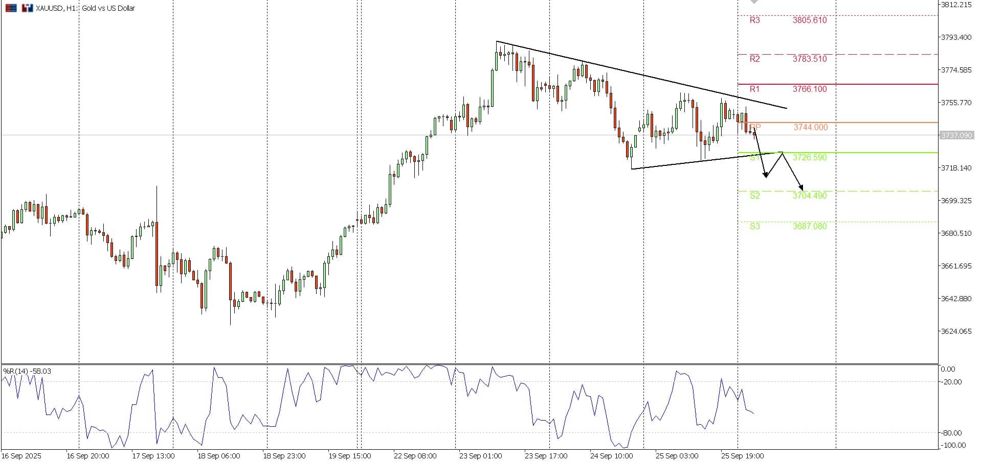 Harga emas (XAU/USD) terlihat membentuk pola segitiga menurun (descending triangle) setelah gagal menembus area resistance di sekitar $3,766. Tekanan jual mulai mendominasi karena harga bergerak di bawah level pivot $3,744. Indikator teknikal juga mengonfirmasi momentum melemah, membuka peluang koreksi lebih dalam dalam jangka pendek.