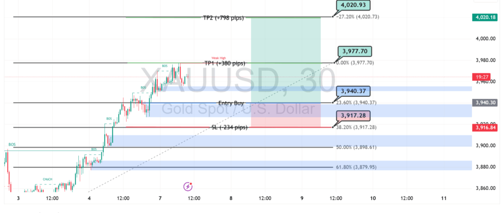 Target kenaikan terdekat berada di area $3.977 (TP1), dengan potensi lanjutan menuju $4.020 (TP2) jika tekanan beli terus meningkat. Struktur harga memperlihatkan pola higher high yang konsisten, menandakan sentimen pasar masih berpihak pada pembeli. Level $3.917 berfungsi sebagai batas risiko (SL) yang perlu dijaga untuk melindungi posisi.
