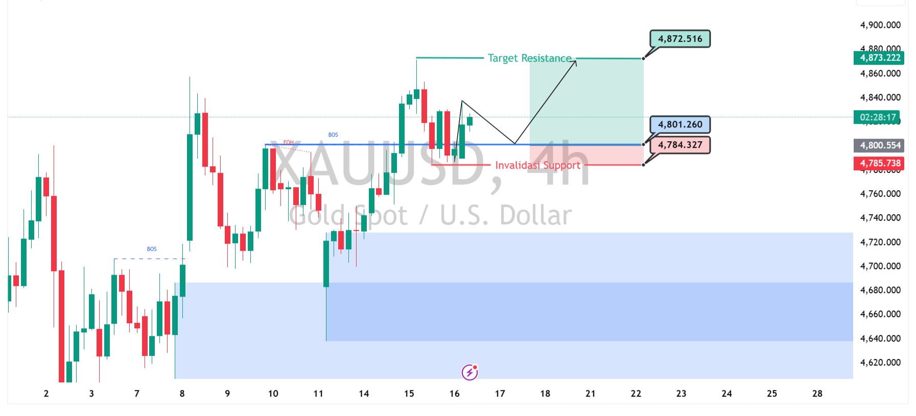 Saat ini harga sedang menguji zona kunci yang berperan sebagai support sekaligus area konfirmasi di sekitar 4.780 – 4.800. Jika mampu bertahan di atas level tersebut, maka potensi kelanjutan bullish semakin valid dengan target berikutnya menuju resistance di kisaran 4.870. Struktur ini mengindikasikan adanya minat beli yang konsisten dari pelaku pasar.