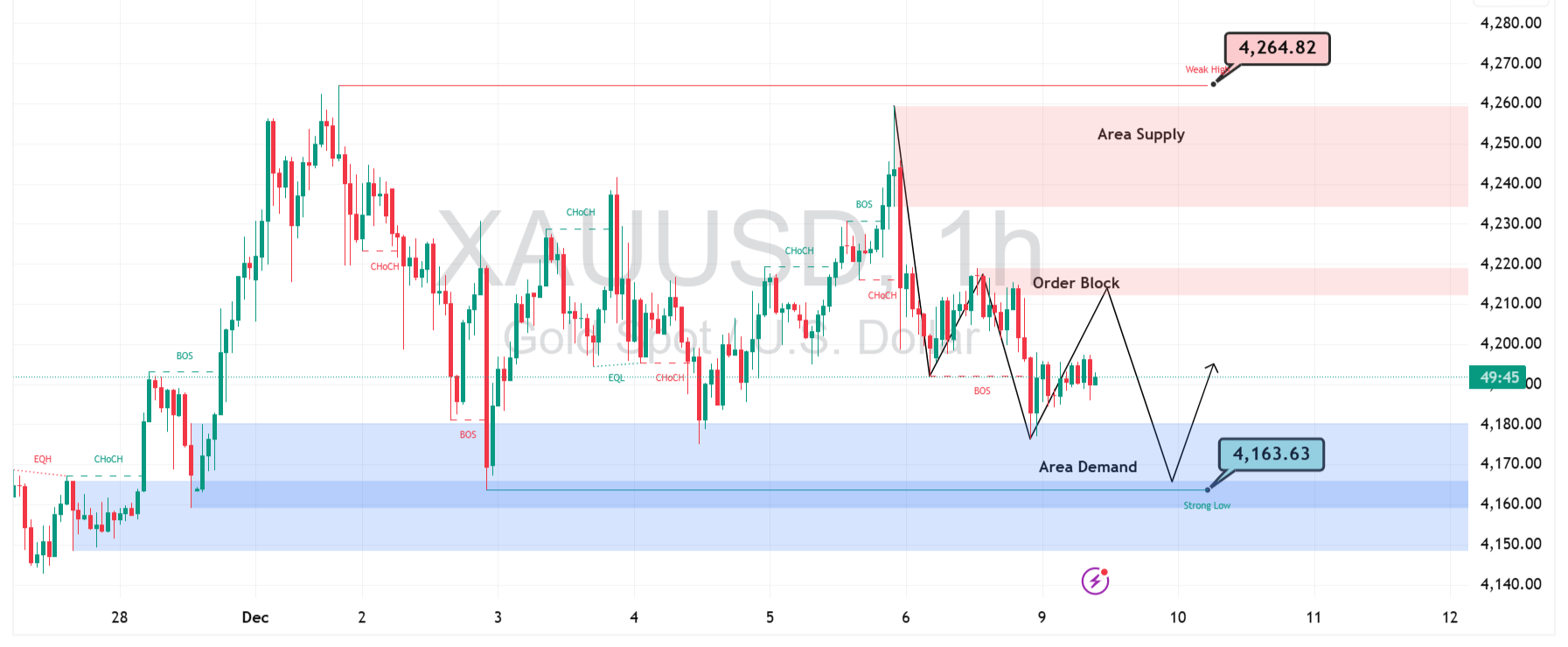 Di sisi bawah, area demand di kisaran $4.150 – $4.165 menjadi zona penting yang mampu menghambat penurunan lebih dalam karena sebelumnya berhasil memicu lonjakan signifikan. Level $4.163 menjadi batas psikologis sekaligus area strong low yang dapat menjadi titik reaksi pembeli jika diuji kembali. Selama zona ini tetap bertahan, peluang pantulan teknikal masih terbuka, terutama ketika reaksi harga membentuk struktur bullish baru.