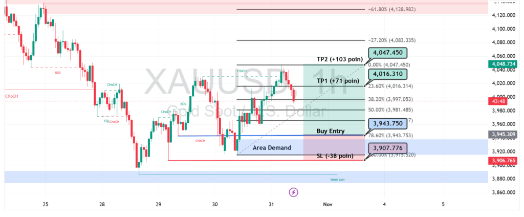 Zona Buy Entry berada di kisaran 3.943, dengan stop loss aman di bawah 3.907, menunjukkan rasio risiko yang terukur. Target pertama di 4.016 dan target kedua di 4.047 menjadi sasaran realistis jika momentum beli terus berlanjut. Indikasi penguatan juga terlihat dari posisi harga yang bergerak di atas retracement Fibonacci 50%, mengonfirmasi adanya minat beli yang meningkat di pasar logam mulia.